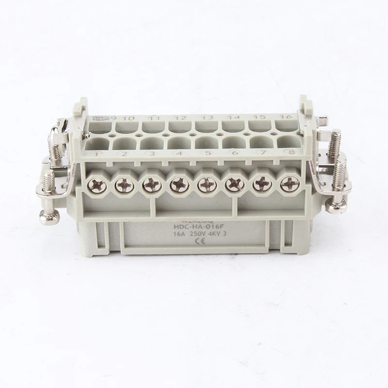 16A 10-Pin-Einsatz-Hochleistungssteckverbinder sind weibliche und männliche inerte Teile. HA-016-M und HA-016-F sind männliche und weibliche Teile, sie sind als Set aufeinander abgestimmt. Sie arbeiten mit Aluminiumgehäusen aus H16A zusammen. Die Einsatzkomponenten und das Außengehäuse bilden zusammen ein komplettes Steckverbinderprodukt. Sie bestehen aus PC-Gehäuse und versilberten Messingstiften. Versilberte Stifte sorgen für gute elektrische Verbindungen.
