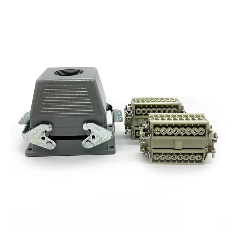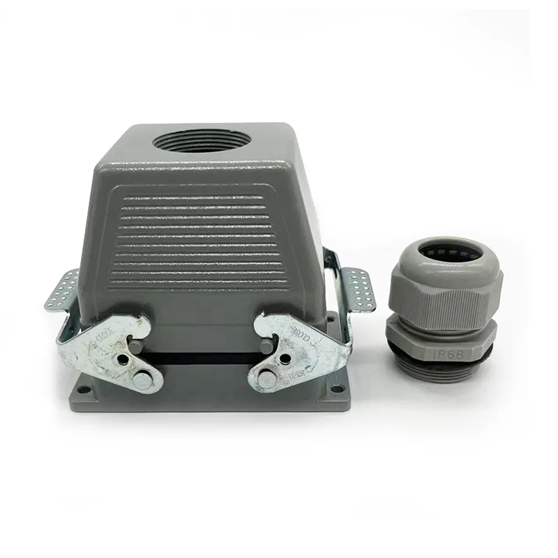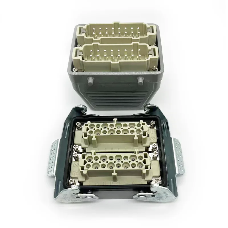 32-polige TG-Hochleistungssteckverbinder sind männliche Gehäuseoberteile. Sie sollten mit männlichen oder weiblichen Einsatzteilen verwendet werden. Normalerweise wird es mit zwei HE-016-M-Stücken befestigt, es gibt jedoch spezielle Kundenwünsche, die es mit zwei HE-016-F-Stücken zusammenbauen. Es ist auch Gehäuse für HSB-016. Dank der wasserdichten Schutzart IP65 kann es auch im Freien verwendet werden. 32-polige TG-Hochleistungssteckverbinder passen zu PG29. Wenn Kunden unterschiedliche Kabelverschraubungsgrößenwünsche haben, können wir diese annehmen und die Produktion in Auftrag geben.