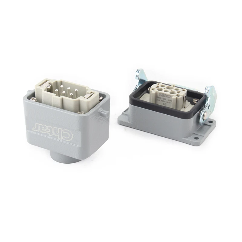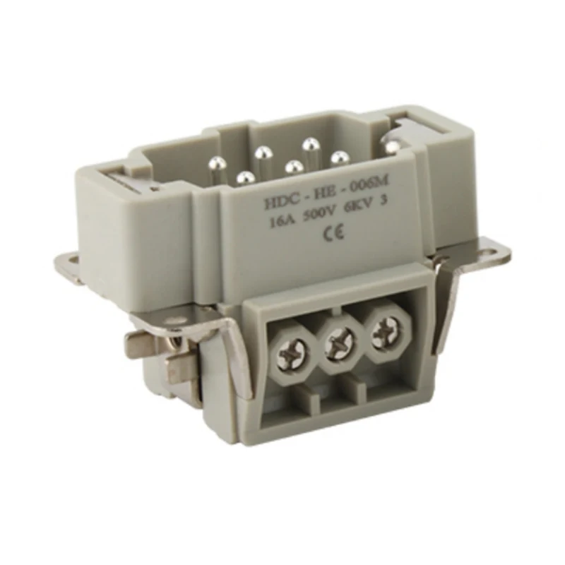 M/F-Hochleistungssteckverbinder mit 6-poligem Einsatz funktionieren bei einem Strom von 16 A. Es handelt sich um 16 Pins zur Kontaktierung mit Drähten. Es eignet sich für unterschiedliche Arbeitsbedingungen und wird häufig in der automatischen Industrie und bei der Verkabelung von Maschinen eingesetzt.